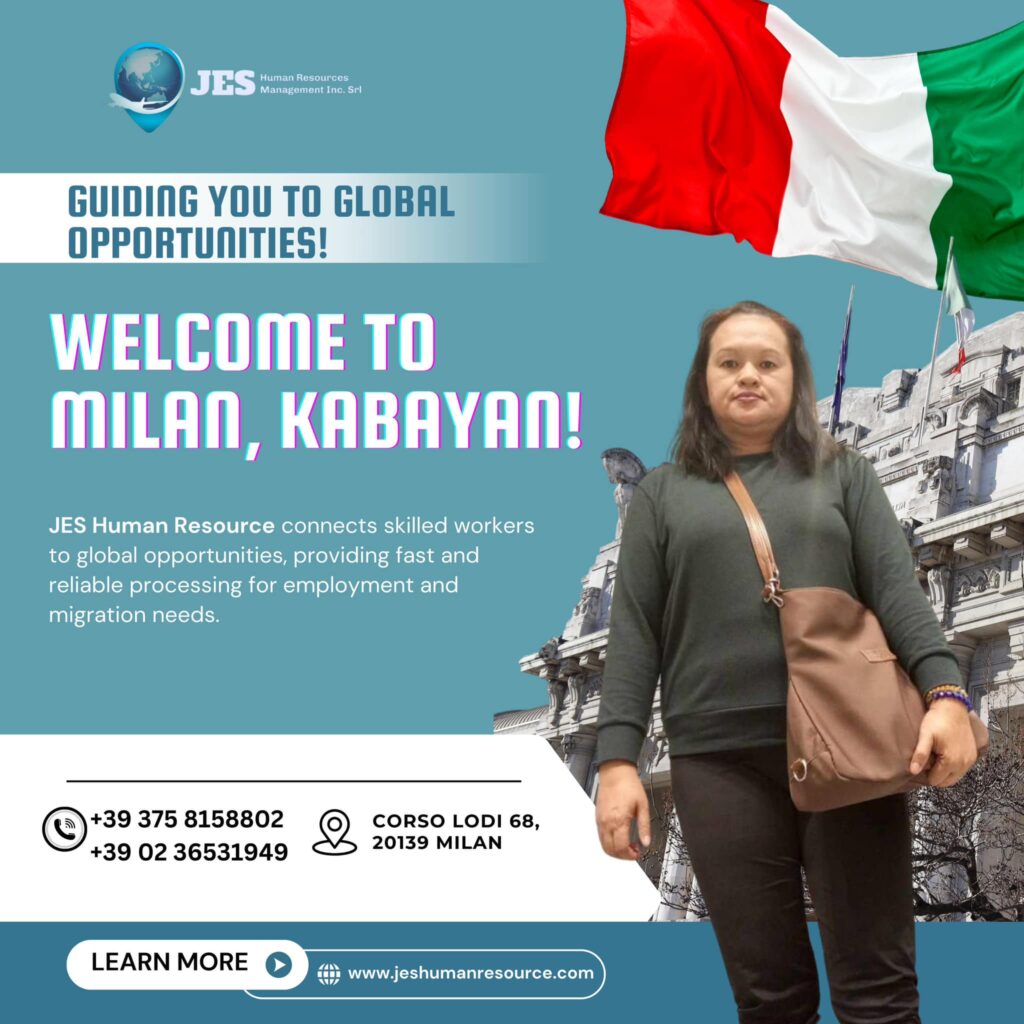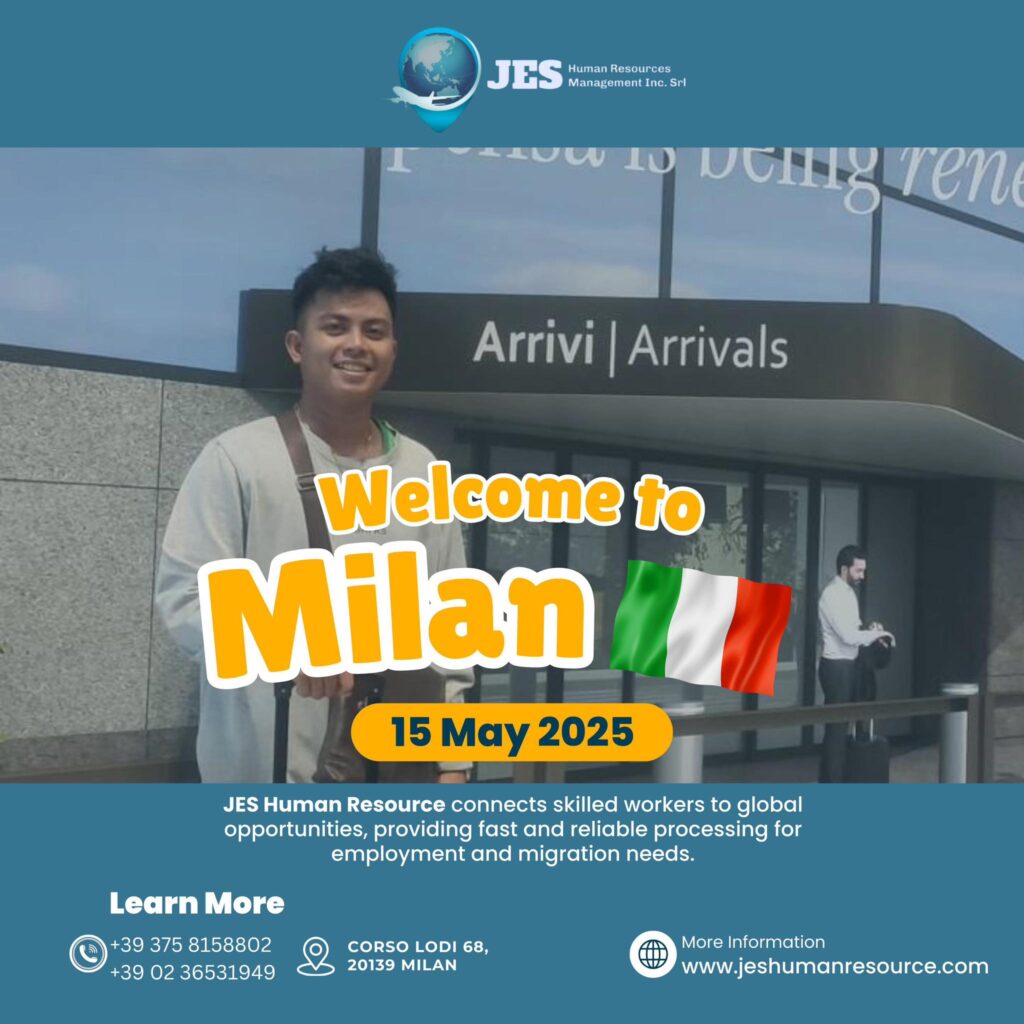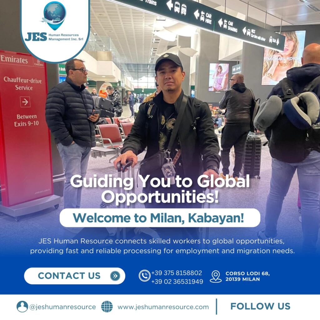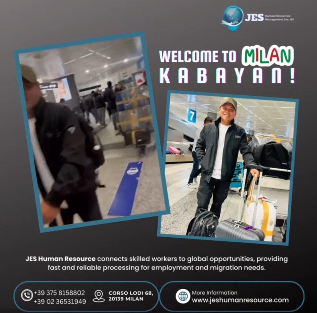 May 15, 2025 – Another proud moment as we welcome one of our kababayans arriving today in Milan, ready to start a new chapter abroad! Behind this milestone is JES Human Resources Management, your trusted Filipino-owned recruitment agency in Italy — helping workers turn overseas dreams into reality through proper processing, coordination, and care. Tuloy-tuloy