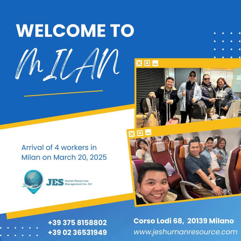 March 20, 2025 | Arrival of 4 workers under Direct Hiring – Decreto Flussi 2024 (Lavoro Subordinato Stagionale). Benvenuti in Italia! Congratulations and best of luck on your new journey! For inquiries, contact us: Corso Lodi 68, Milan +39 375 815 8802 | +39 02 36531949 www.jeshumanresource.com #JESHumanResource #MilanJourney #LavoroSubordinatoStagionale #FlussiLavoratori