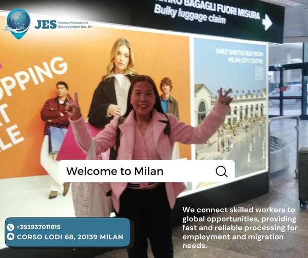October 25, 2025 โ€“ We joyfully welcome another Household Service Worker who has just arrived in Milan, Italy! Each arrival reminds us that every dream, no matter how far, can come true with dedication, faith, and the right support. JES Human Resource Management continues to stand beside every Filipino worker โ€” guiding, assisting, and opening