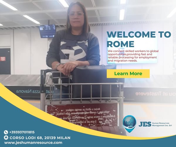 October 24, 2025 โ€“ Another proud moment for JES Human Resource Management as one of our hardworking household service workers safely arrived in Rome, Italy! Each arrival is more than just a destination โ€” itโ€™s a story of determination, faith, and a dream finally coming true. Through the continued guidance and support of JES Human